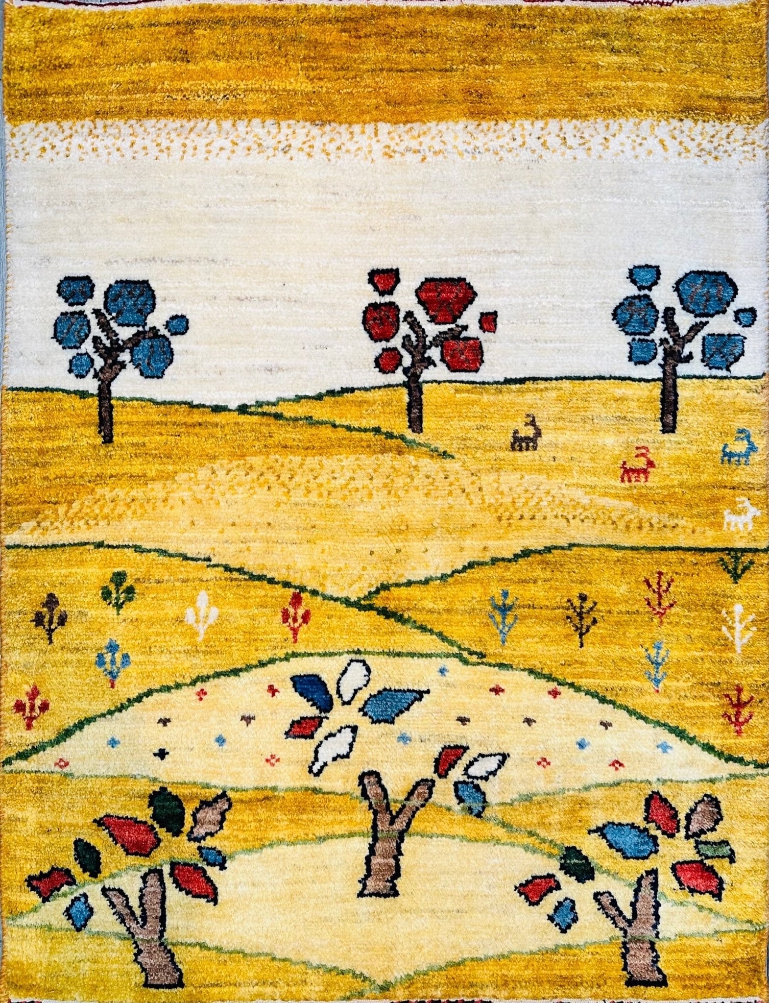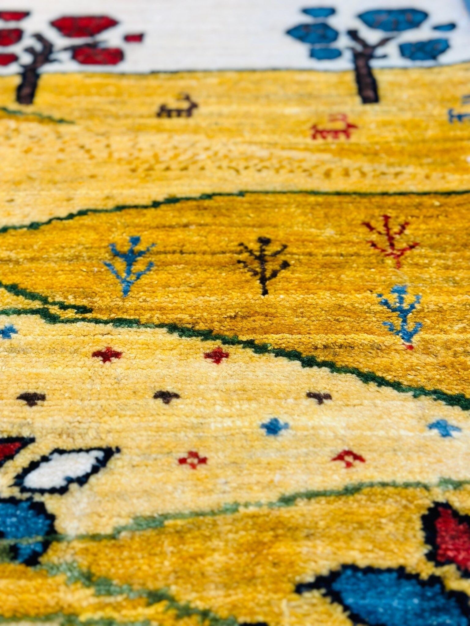 高品質なペルシャギャッベでございます。黄金色のウールはきらきらと美しく艶があり、ふんわりと柔らかな触り心地。ざっくりとしたデザインが大変可愛らしい一枚です。