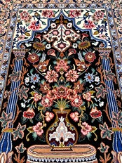 ペルシャ絨毯でよく見られる花瓶のデザイン。テーブルと柱も加わり建物の中をイメージする一枚となっております。繊細なデザインは手織りだということを忘れてしまうほど、密な結びとなっております。シルクの部分が立体的に見え、よりデザインがリアルに見えます。
